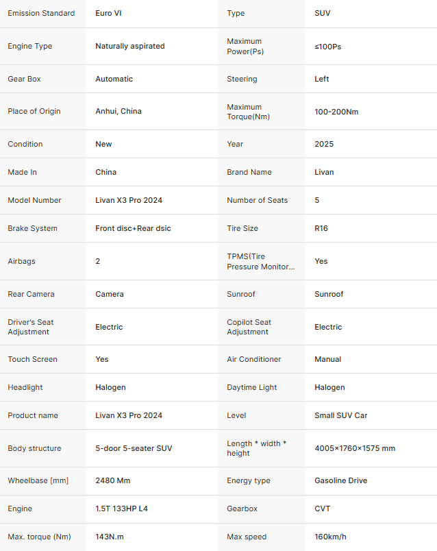 Feature highlights:The 2024 Livan X3 Pro is a compact SUV featuring a 1.5L CVT engine with 133HP, offering efficient performance and a maximum speed of 160km/h. Equipped with advanced features such as TPMS, rear camera, sunroof, and halogen headlights, it ensures safety and convenience. The vehicle supports electric seat adjustments, manual air conditioning, and includes a 5-door 5-seater design suited for urban and family use. With export qualifications and global availability, this model guarantees quality assurance through pre-production samples and final inspections.