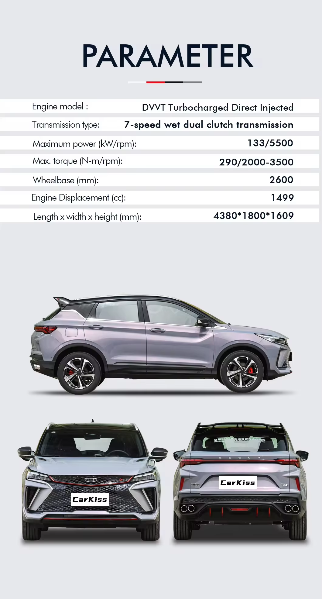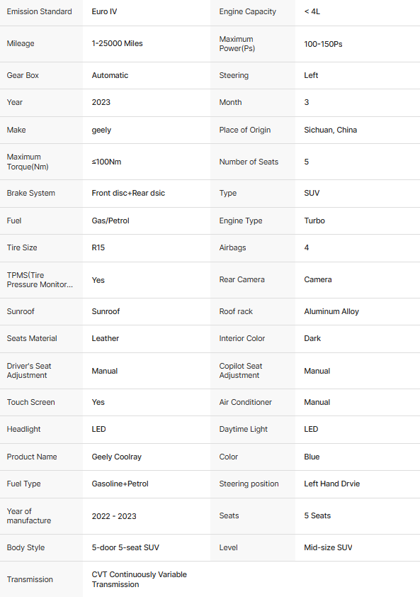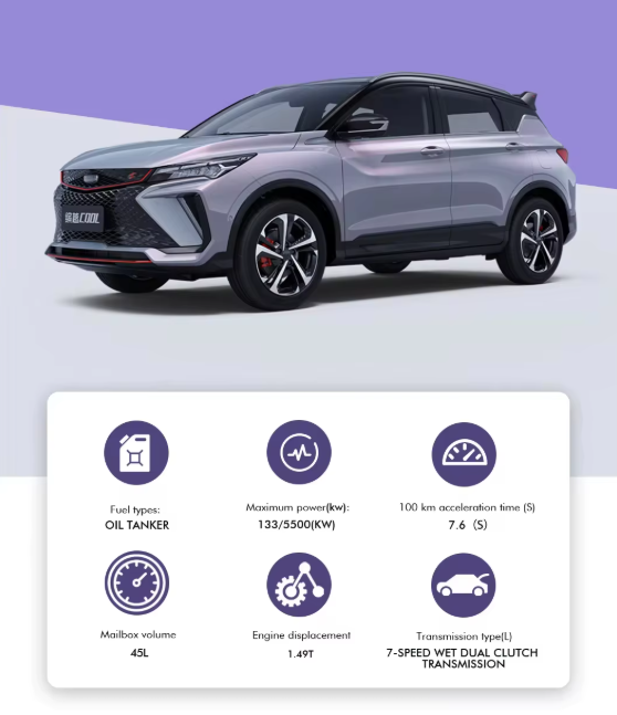 Feature Highlights: The Geely Coolray Binyue SUV is a mid-size model equipped with a powerful 1.5T turbocharged engine, delivering a maximum power of 100-150 Ps and a torque of ≤ 100 Nm. It adopts a 5-door, 5-seat configuration, automatic transmission, and advanced safety systems including ABS (Anti-lock Braking System), ESC (Electronic Stability Control), TPMS (Tire Pressure Monitoring System), and 4 airbags.