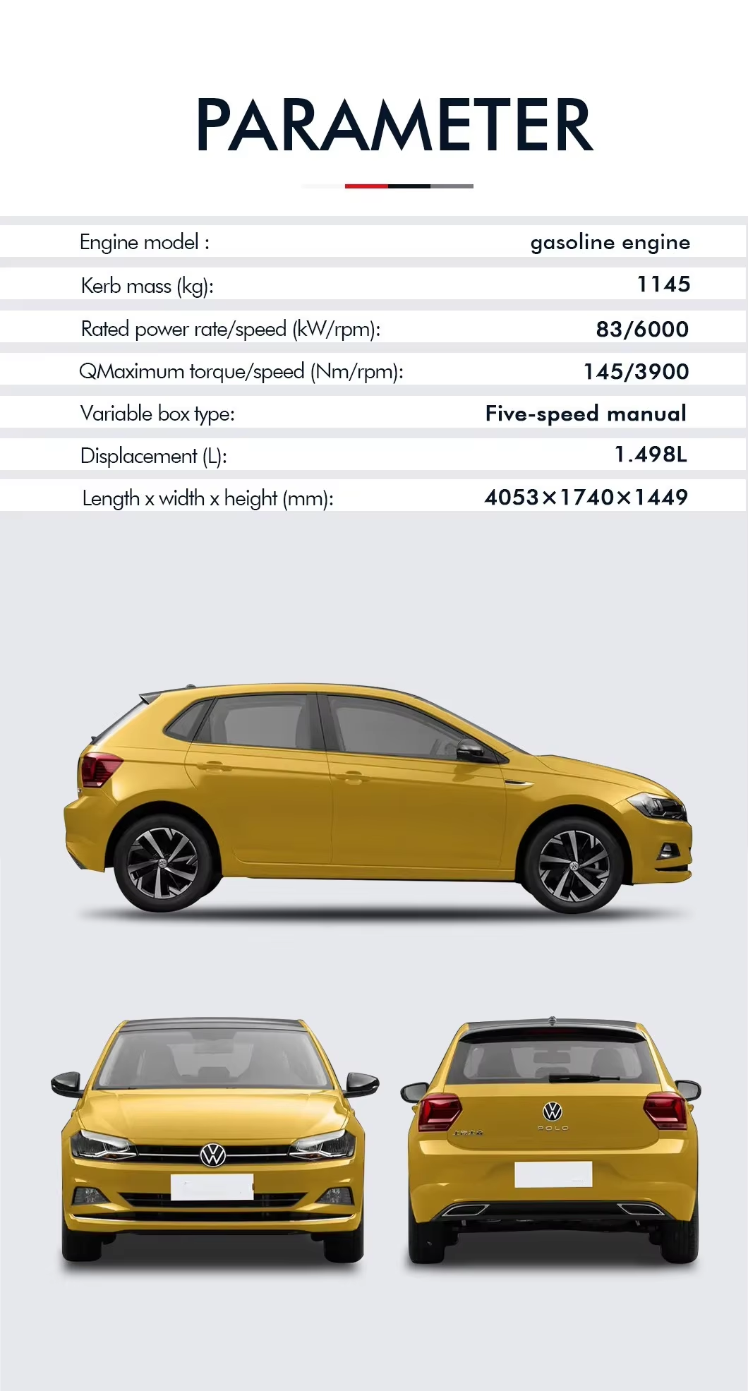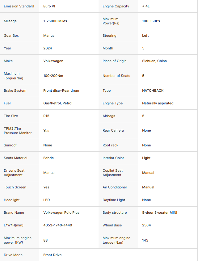 Feature highlights:This 2024 Volkswagen Polo Plus is a stylish and reliable hatchback equipped with advanced features like LED headlights, TPMS, ESC, ABS, and a multi-function steering wheel. Its naturally aspirated engine delivers 100-150Ps with a maximum torque of 100-200Nm, ensuring smooth performance. The electric front and rear windows, along with manual air conditioning and fabric seats, enhance comfort for its 5 passengers.